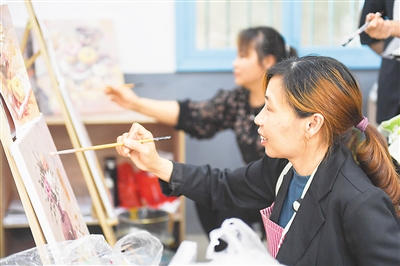 近年來,湖南省瀏陽市小河鄉引進農民畫室產業,讓農民可以在家務農時利用空余時間務工。小河鄉現有460余名農民畫師,累計帶動50余名貧困戶參與。圖為小河鄉烏石村村民在繪制油畫。