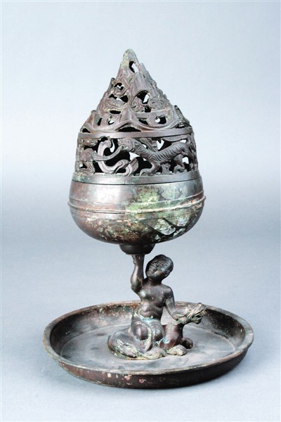 西漢鎏銀騎獸人物博山爐,河北博物館藏。1968年,河北滿城陵山二號漢墓發掘出土。在西漢,人們喜愛焚香熏煙,來驅瘟防疫,養生祛病。