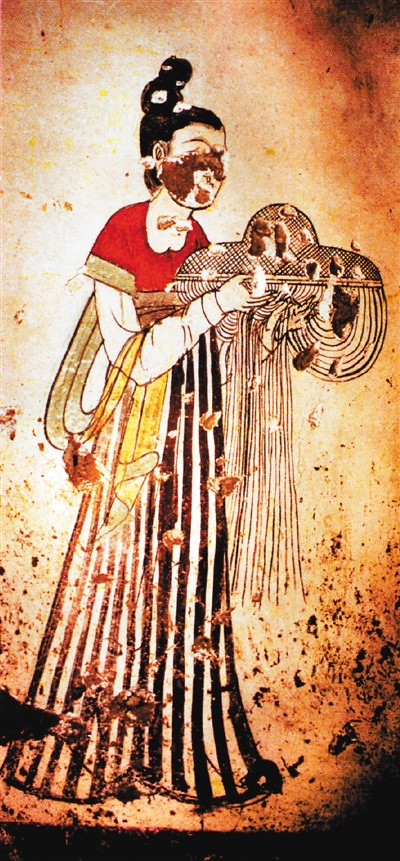 唐燕妃墓捧帷帽侍女壁畫,昭陵博物館藏。1990年,唐太宗的妃子燕氏的墓室被清理出來,墓室壁畫中,宮女手中所捧的帷帽垂掛著一圈長絲穗,形成一道薄幕,有一定衛生防護功能。