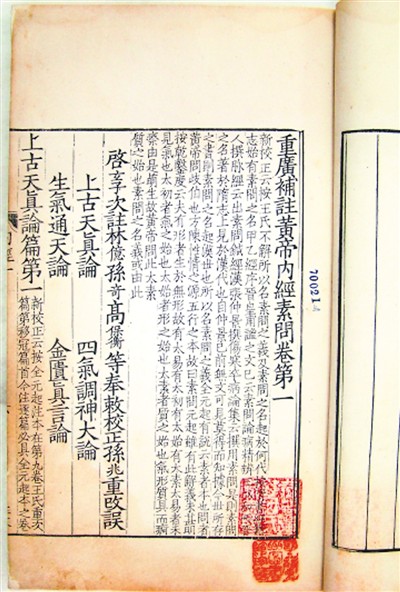 明嘉靖二十九年重廣補注黃帝內經素問二十四卷,甘肅省圖書館藏。《黃帝內經》提出對瘟疫要早發現早治療,治療后防止復發。