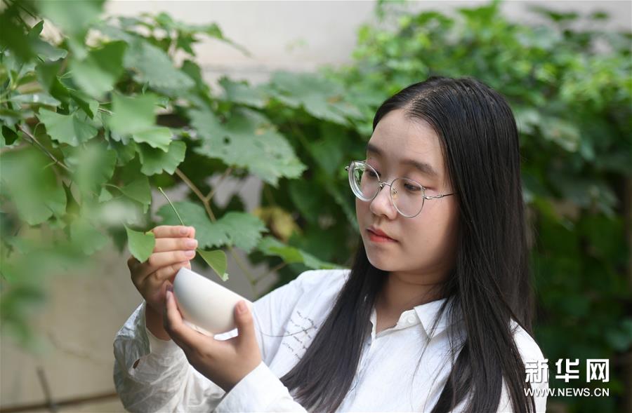 8月24日,屠金歌在戶外尋找適合制作木葉盞的樹葉。新華社發(趙子碩攝)