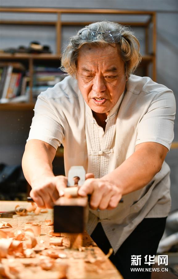 8月25日,在天津職業大學辛全生大師木藝工作室,辛全生在用刨刀刮料。今年62歲的辛全生是天津市南開區傳統木工榫卯技藝的非遺代表性項目傳承人。2019年9月,天津職業大學為發展并傳承木工技藝,邀請辛全生作為老師給學生們授課,負責教授學生們榫卯結構知識和木藝家具制作等實用技巧,并于2019年底在校內建立辛全生大師木藝工作室。 辛全生出生于匠人家庭,他聽從父親的建議從16歲開始學習木工。40余年的木工生涯,辛全生經歷過木工行業曾經的紅火和后來的逐漸衰落,也曾在最艱難的時候做過別的營生。但無論如何,辛全生始終忘不了自己的木工身份。“老祖宗留下來的東西不能丟了,要傳承下去,否則將來的后代誰都不知道木工榫卯技術的存在了。”辛全生說。 近年來,有近百名不同職業、不同年齡的人慕名前來拜辛全生為師,學習傳統木工榫卯技藝。辛全生說,我會讓徒弟們學好木工榫卯技藝,讓中國的傳統手藝發揚光大。新華社發(孫凡越 攝)