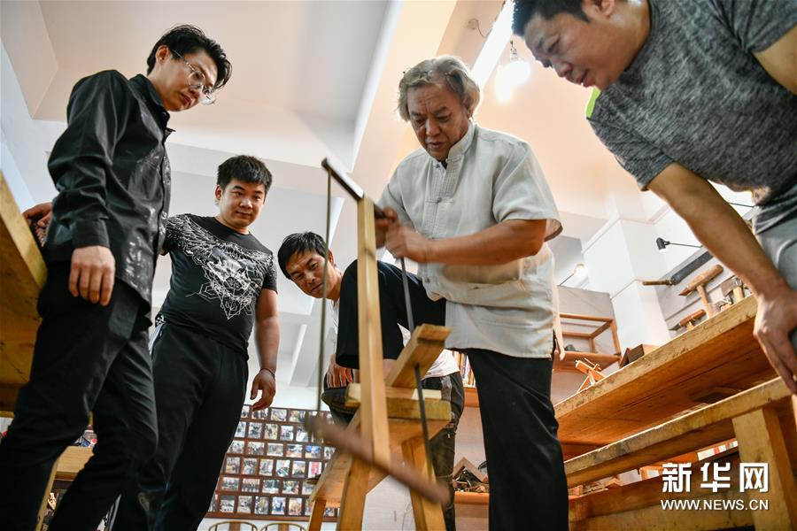 8月25日,在天津職業大學辛全生大師木藝工作室,辛全生(右二)給徒弟們演示開料流程。新華社發(孫凡越 攝)