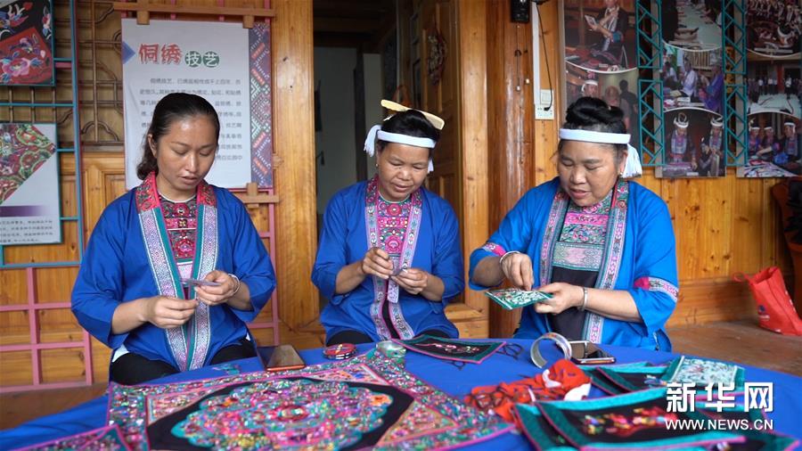 楊甜介紹,近年來,同樂鄉大力推動侗繡技藝傳承,采取“公司+基地+農戶(貧困戶)”運行模式,組織技藝傳承人將侗繡技藝傳授給當地婦女,帶動當地群眾300多戶參與刺繡,其中貧困戶50多戶,侗繡作品被銷往國內外,實現了助農增收。