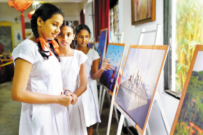 9月29日,在斯里蘭卡首都科倫坡的總統女子學校小禮堂,學生們觀看展出的中國四川風光攝影作品。新華社記者 唐 璐 攝