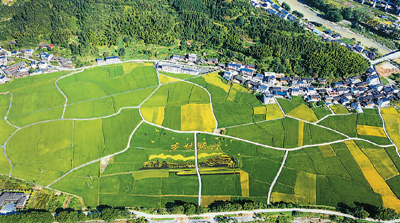 今夏,湖南省懷化市溆浦縣北斗溪鎮坪溪村三百稻田中的“鄉村振興”和小橋流水圖案引人矚目。雷文錄 攝(人民圖片)