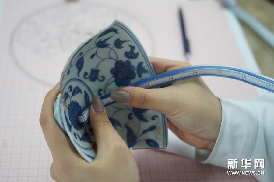 修復(fù)師何奕慧在測量一件瓷器,將三維瓷器上的圖案還原到二維的紙面上,必須要經(jīng)過仔細的測量(12月3日攝)。新華社記者 周密 攝