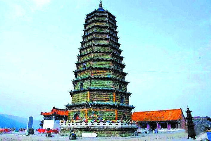 獅子窩琉璃塔,位于忻州市繁峙縣巖頭鄉莊子村,坐落在五臺山臺懷鎮西南十公里的山腰處,系明代建筑。據寺內五層塔銘記載,獅子窩琉璃塔為明萬歷二十七年(1599年)春季吉日始建,萬歷三十二年(1604年)完工。塔身坐落于原寺院的中軸線建筑大雄寶殿之后、藏經樓之前,是當年五臺山大護國文殊寺的主要建筑之一。 2004年6月10日,繁峙獅子窩琉璃塔被山西省人民政府公布為第四批省級文物保護單位;2019年10月,被國務院核定并公布為全國重點文物保護單位。 關于“獅子窩”得名由來,《清涼山志》中有載:“相傳昔人在此見億萬獅子游戲。獅子乃文殊之乘騎,獅戲于此,文殊必在當空,建寺祀之,名曰文殊寺,俗稱獅子窩?!泵魅f歷二十七年(1599年)三月,萬歷皇帝派太監王忠赍送《大藏經》藏于獅子窩,并賜寺額曰“大護國文殊寺”。 琉璃塔坐北朝南,前有石獅一對,后為佛殿、配殿和禪堂。塔高32米,底徑12米,頂徑4米,共十三層,平面呈八邊形,八個角各設黃琉璃倒棱方柱,柱頂為磚磨檐檁,隨檁枋?;鶠槭鍪殢浭?,雕仰覆蓮瓣。塔身中空,為雙層套筒結構,青磚砌筑。塔體外表皆以黃、綠、藍三彩空心琉璃磚鑲嵌,配有層層金黃色祥云,除脊獸瓦垅外,周身還鑲嵌著金色琉璃佛像。佛為坐佛,部分佛尚有環形背光,每層各面分布五層十五排佛像,共計萬尊,故該塔又稱“萬佛塔”“萬佛延壽寶塔”“佛像典翠琉璃塔”。佛像袈裟為孔雀藍色釉面,頭、胸為黃色釉面,各像側面還雕刻有施舍者姓名,其中既有太監、內官監,也有商賈、平民。