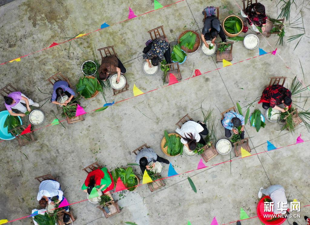 6月2日,貴州省銅仁市玉屏侗族自治縣亞魚鄉郭家灣村村民參加包粽子比賽(無人機照片)。端午節將至,貴州省銅仁市玉屏侗族自治縣亞魚鄉郭家灣村舉行“我們的節日,端午”群眾文化活動,村民們聚在一起比賽包粽子,喜迎端午節。新華社發(胡攀學攝)