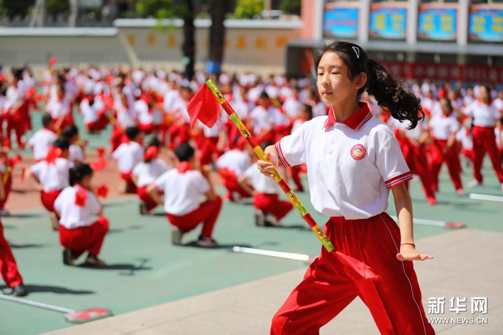 6月10日,在承德市雙橋區南營子小學,學生在大課間上練習“霸王鞭”。近年來,河北省承德市雙橋區南營子小學以開展“陽光大課間”為平臺,將非遺民間舞蹈“霸王鞭”融入學校素質教育實踐中,通過聘任專業老師,開設“霸王鞭”體育運動社團,引導小學生在大課間上練習“霸王鞭”,增強體質,傳承非遺。新華社發(劉環宇 攝)