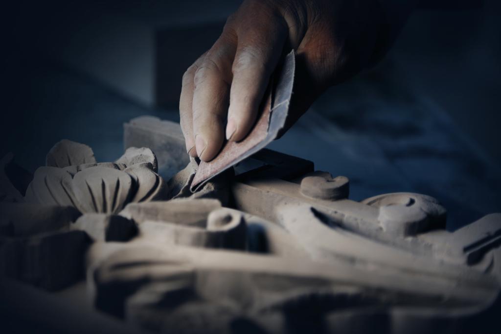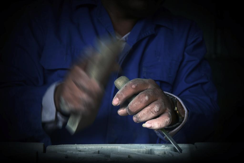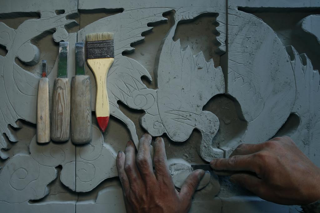 磚雕“福祿壽” 修復期間,汾陽方面待王鎖貴如上賓,日工資每天500元,好吃好喝每天還安排免費洗澡。“代縣磚雕”,在呂梁一時聲名顯赫。 同年,王鎖貴還對大同七峰山遼代古塔進行了修復。七峰山塔為遼代禪房寺塔,實心磚石結構,為第六批全國重點文物保護單位。塔身四面有磚雕拱券門和半圓形雕窗,塔身各處布滿磚雕,修葺前均嚴重風化。王鎖貴吃住在山上,歷時數月,讓這座千年古塔重放光彩。 大同鳳臨閣飯店的磚雕裝飾工程,進行了整整8年。 鳳臨閣是大同最出名的“老字號”,相傳是明朝正德皇帝與李鳳姐相識的地方,也就是京劇《游龍戲鳳》所講故事的發源地。王鎖貴設計、施工的“有鳳來儀”磚雕照壁,長16米、高4米5,磚雕斗拱垂柱、圓雕鳳凰工藝精湛,被古建專家譽為“雁北第一影壁”??偨ㄖ娣e6000平方米的主樓內曲欄回廊、移步異景,大量表現大同歷史名勝景點和故事傳說的精美絕倫的雕刻和雕塑隨處可見,其中的磚雕全部出自王鎖貴的手筆。施工期間,出資方還組織參與施工的、來自全國各地的工匠舉行了一次“技術大比武”,結果王鎖貴獲“三雕”(磚雕、石雕、木雕)比賽第一名。 后來,還以鳳臨閣為外景地拍攝了古裝電視連續劇《鳳臨閣》,在全國衛視播放。 此外,王鎖貴還參與了有“山西省第一座皇家寺廟”之稱的懷仁崇國寺和壽陽“三代帝師”祁寯藻故里的修復工程。他在祁氏故里的磚雕作品,隨著以此為外景地拍攝的電視劇《天地民心》而廣為人知。 在榆次老街、在雁門關、在偏關老牛灣、在忻州古城,都可以看到王鎖貴制作、安裝的磚雕作品。至于通過訂單訂制的磚雕,被大量運用在北京、貴州、杭州等地的古建修復工程上。 永恒 王鎖貴說,磚雕從原料選取到全部工序完成要經過30多個環節。 望臺村一帶土質細膩綿軟,用其燒制青磚光滑耐磨、不易風化、適宜雕刻。制磚坯用的黃土先要用細篩子篩過,和成泥后須赤腳反復踩踏。 把泥踩得比較“筋道”后,再用塑料布將其緊緊裹住“悶”好幾天,如此燒制出的青磚才硬度適中、材質細膩,沒有氣泡。在制泥這道工序,現在用機器攪拌,省時省力,效果也更好。 經過選土、制泥、制模、脫坯、晾坯、入窯、看火、上水、出窯九道工序,成磚出窯。青磚出窯后,須嚴格剔除焦磚、裂磚、變形磚。一窯成磚中,大抵可篩選八成左右的雕磚成品。 雕前先“打樣”:把設計稿拓印在涂抹過石灰水的磚面上,或者在磚塊上直接描畫。現在許多外地磚雕加工廠多用電腦打樣,生產出來的是“制式”產品,千篇一律。磚雕常用的圖案王鎖貴早已爛熟于心,想要的圖案在青磚上一揮而就,當真是“鐵劃銀鉤”、揮灑自如。如此,則構圖更加生動,細節更加充盈,最主要的是絕不雷同。接下來“打坯”:用鑿子或刻刀粗略勾勒畫面輪廓,分出基本層次。最后是“出細”:運用多種工具,或鏟、或刻、或挑,以刻畫細節。 打樣、打坯、出細,只是對磚雕三道主要工序的概括。詳細說,則有“耕”——用最小的鏨子將畫好的紋樣淺描一遍,防止磚坯上的畫稿在雕刻時被抹掉;“鑿”——用小鏨子將主體形象以外多余部分除去,突出主體形象,增加立體感,為下一步工序打基礎;“齊口”——用鏨子沿主體紋樣的側面作進一步細致的剔雕;“桶道”——用鏨子將紋飾中細微處雕刻清晰,包括人物須發、花草葉子的筋脈、飛禽走獸的羽毛;“開相”——對磚雕作品中的人物面部進行修飾;“磨”——用特制的磨頭將紋飾內外的粗糙處打磨平整、精細;“上藥”——用松香、黃蠟和專門配制的藥物對磕碰處進行修補;“打點”——磚面兒加水調和成漿,將雕刻好的作品擦拭干凈。 雕刻一件作品,往往要用到幾種雕刻技法。 平雕:在青磚的平面上雕刻圖案,以花草等紋樣為主;浮雕:在一個平面上雕刻出凹凸不平的線條和條塊,按其凹凸的程度,又分淺浮雕和高浮雕。透雕:介于圓雕和浮雕之間的雕刻技法,將紋樣雕刻得更細致、多層次,以增加作品的透視性和立體感;圓雕:對材料進行立體雕刻,作品可以從各個方位觀賞。此外,還經常采用雕刻和鏤空相結合的手法,或圓雕或半圓雕,使所雕部位躍出畫面,層次分明。次要部位和襯景,則用浮雕方式處理。總之,陰線刻、凹面線刻、凸面線刻、淺浮雕、高浮雕、鏤空式透雕等技法的綜合運用,使得一幅磚雕重重疊疊、里呼外應、渾然一體,呈現強烈的立體感。 2009年,王鎖貴組建起自己的團隊。帶出的幾十個徒弟,不少成為全國各地磚雕工廠的頂梁柱。磚雕是個“水磨”功夫,必須“慢工出細活”。王鎖貴設在望臺村的山西華都古韻古建筑工程有限公司每年可以完成磚雕作品近3000平方米。普通磚雕每平方米售價千元左右,工藝復雜、精雕細刻的作品,最高售價一平方米6000元?,F在,公司的業務全部走訂單、產品走物流,一些大型磚雕,王鎖貴和徒弟們還上門安裝。 說起磚雕的未來,王鎖貴憂心忡忡。“望臺磚雕”——這個在王鎖貴手上“復活”的傳統技藝,現在面臨后繼無人的窘境。王鎖貴廠子里的工人,都在45歲以上。年輕人不想學,主要是“嫌臟”——雕刻時青磚粉塵彌漫,還得隨雕隨用嘴吹,現在看來,還沒有很好的解決辦法。 老話說“三年學不成個木匠”。王鎖貴說,要想把磚雕手藝初步學到手,沒有五年時間根本不可能。在一個人人想掙“快錢”的時代,磚雕,這個“板凳一坐五年