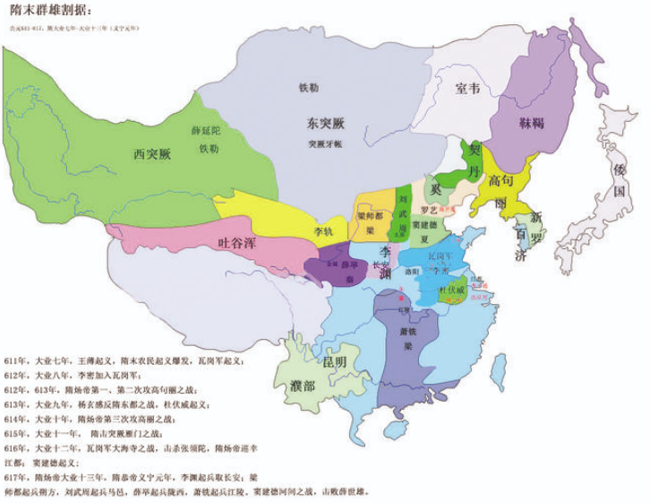 在始畢可汗的支持下,當(dāng)時(shí)有三大反隋勢力崛起,分別為西南的梁師都及其盟友、東北的竇建德及其盟友、北部的劉武周和李淵父子。