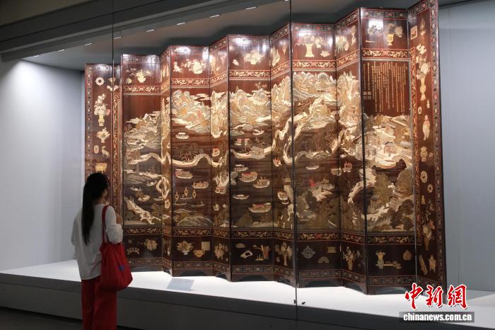 9月11日,游客在館內的《刻灰西湖全景圖十二扇漆器屏風》前駐足。曹丹 攝
