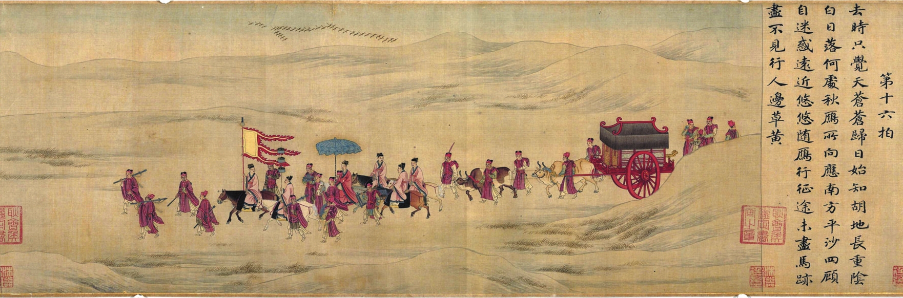 通過出土和存世的一些圖像,我們可以一窺漢代旄節之真容。洛陽燒溝61號西漢壁畫墓中的壁畫磚上繪有一持節使者;山東嘉祥武氏祠一組畫像中,描繪了漢使持節拜見王陵之母的場景,手中所持之節正是旄三重,只是看起來柄長不到八尺。至于“旄節之制”,漢代與先秦當是有別的,將旄牛尾編成三重流蘇的制節之法始于漢,《事物紀原》載:“漢人有持節,乃古旄也。然則節自周始,而旄節則起于漢也。”這種持節使的形象,在南宋人所繪《胡笳十八拍》和《迎鑾圖》等表現外交題材的畫作中,仍有清晰體現,可見這種持節出使的制度在古代一直延續。