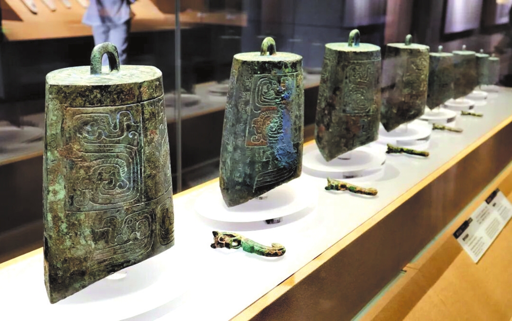 最具代表性的樂鐘無疑是“青銅之冠”的曾侯乙編鐘,它展現了先秦禮樂文明與青銅鑄造技術的最高成就。曾侯乙編鐘是戰國早期曾國國君的“禮樂重器”,1978年出土于今湖北隨州的曾侯乙墓,是迄今發現數量最多、保存最好、音律最全、氣勢最宏偉的一套編鐘,共65件,分3層8組懸掛于彩漆鐘架之上,鐘體總重達2.5噸。整套編鐘低音渾厚、中音圓潤、高音清脆,音域寬廣,而且中心音域內半音齊備,可以旋宮轉調,演奏各種音樂。1978年8月1日,沉寂了2400多年的曾侯乙編鐘演奏了《東方紅》《國際歌》和古曲《楚殤》、民族歌曲《草原上升起不落的太陽》等各種樂曲,樂音悠揚回蕩。
