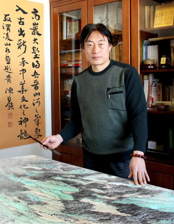 認識殷渭凌,是先認識他的畫,前幾年在一次省里畫展上看到了一幅山水畫,淳樸、厚重,樸實的親切、厚重的實在,完全沒有近幾年流行的風氣,也沒有長期臨摹傳統繪畫形成的習氣。正如一個從鄉村走出來的小伙,健康、有朝氣、單純、樸實、憨厚、怯生生的站在那里,給我留下了很深的印象。因為忻州地區畫山水的人不多,很快就認識了渭凌。果然人如其畫,淳樸、厚道、話不多、為人真誠,是個畫畫肯下功夫的小伙子。后來省美協山水畫藝委會的活動都有他的身影,畫越畫越多,畫的也越來越好,但是畫面中那種親切、樸實、厚重、蒼茫的特點卻一點兒也沒有丟失。濃濃的泥土氣息生發于筆墨中,散發在畫面里,在展廳里感染著每一個觀眾。晉西北風情在他的營造下得到了充分的體現。