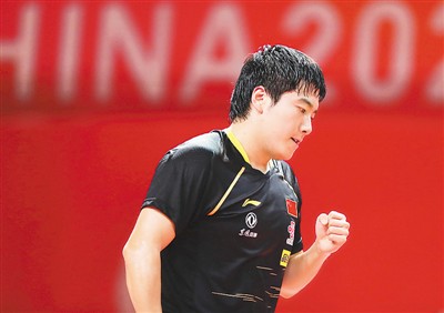 8月14日,梁靖崑在比賽中慶祝得分。當日,在海南陵水舉行的中國乒乓球隊奧運模擬賽男子單打決賽中,梁靖崑以4比2戰勝王楚欽,獲得冠軍。