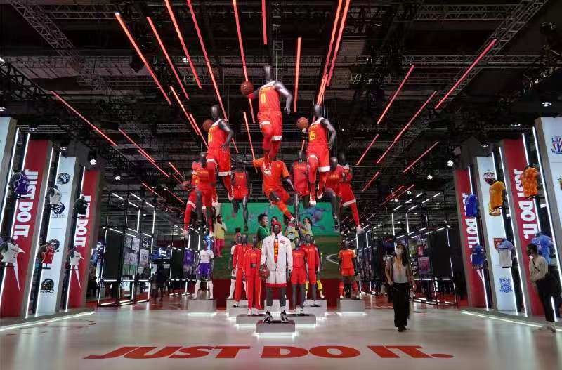 這是11月7日在進博會消費品展區拍攝的耐克展臺。新華社記者 李任滋 攝