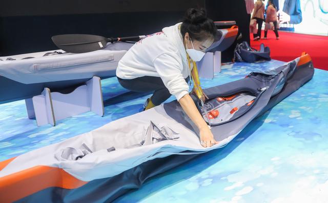 11月6日,工作人員在進博會消費品展區的迪卡儂展臺演示可折疊皮劃艇如何安裝。新華社記者 丁汀 攝