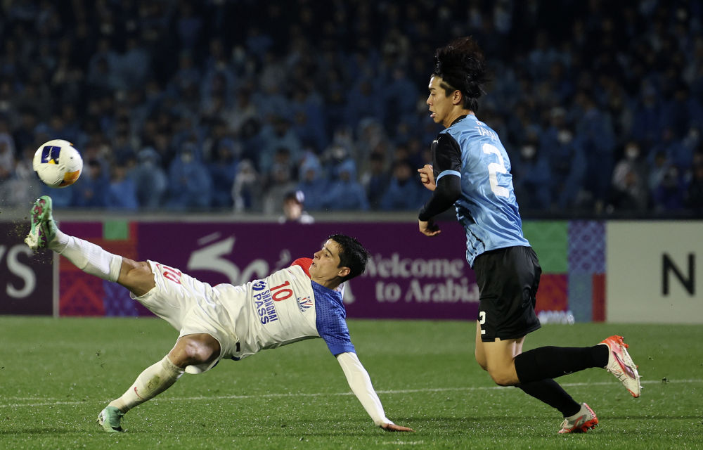 3月12日,上海申花隊球員劉誠宇(左)與川崎前鋒隊球員丸山祐市在比賽中拼搶。新華社記者 賈浩成 攝