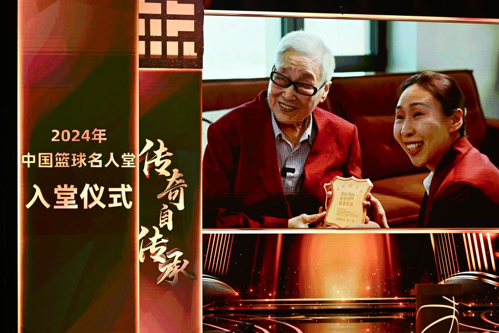 3月23日,入堂儀式上播放中國(guó)籃球名人堂入堂人物“杰出女運(yùn)動(dòng)員”楊潔(左)領(lǐng)取徽章的視頻。新華社記者 陳鐘昊 攝