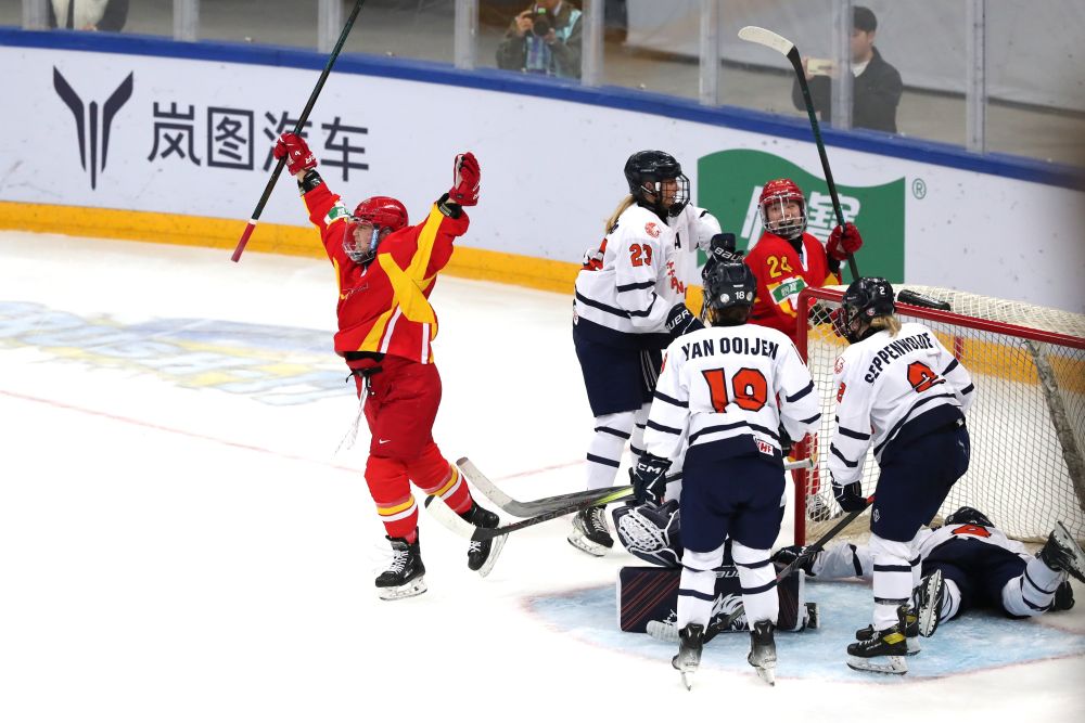 比賽伊始,雙方攻勢積極。第三分鐘,荷蘭隊打出精妙配合,科拉德門前補射得手,冰球從中國隊門將詹佳慧腿下滑入球網,比分變為0:1。