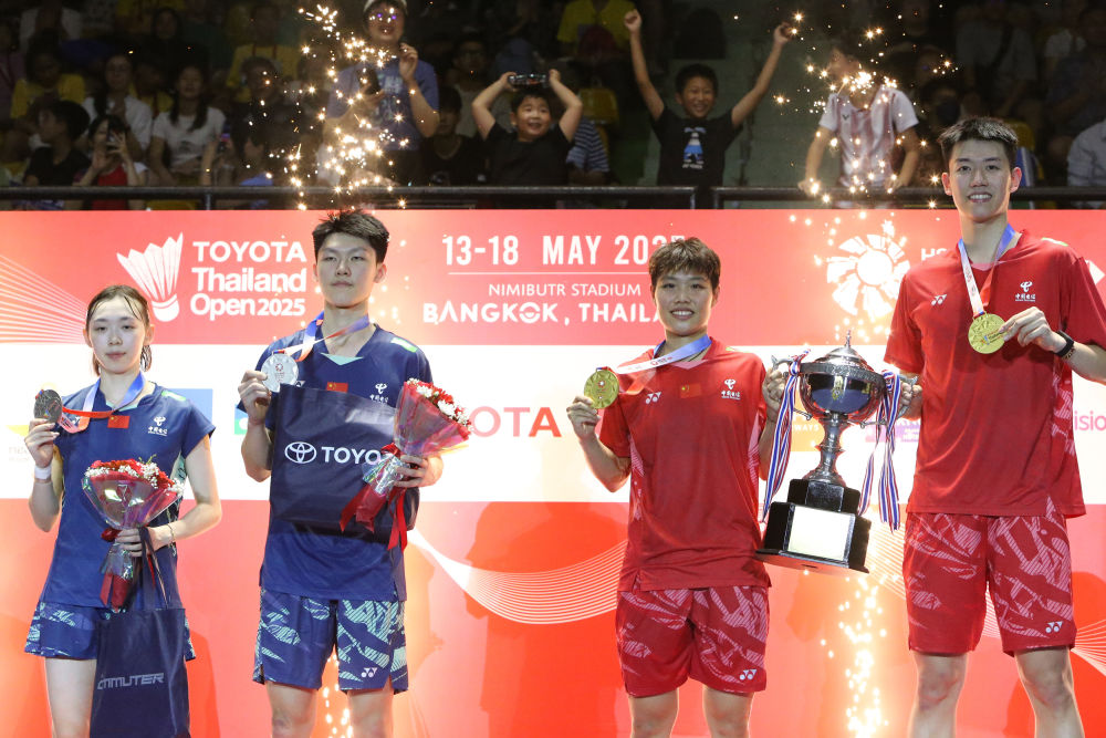 5月18日,冠軍馮彥哲(右一)/黃東萍(右二)和亞軍高家炫(左二)/吳夢瑩在頒獎儀式上。新華社發(拉亨 攝)
