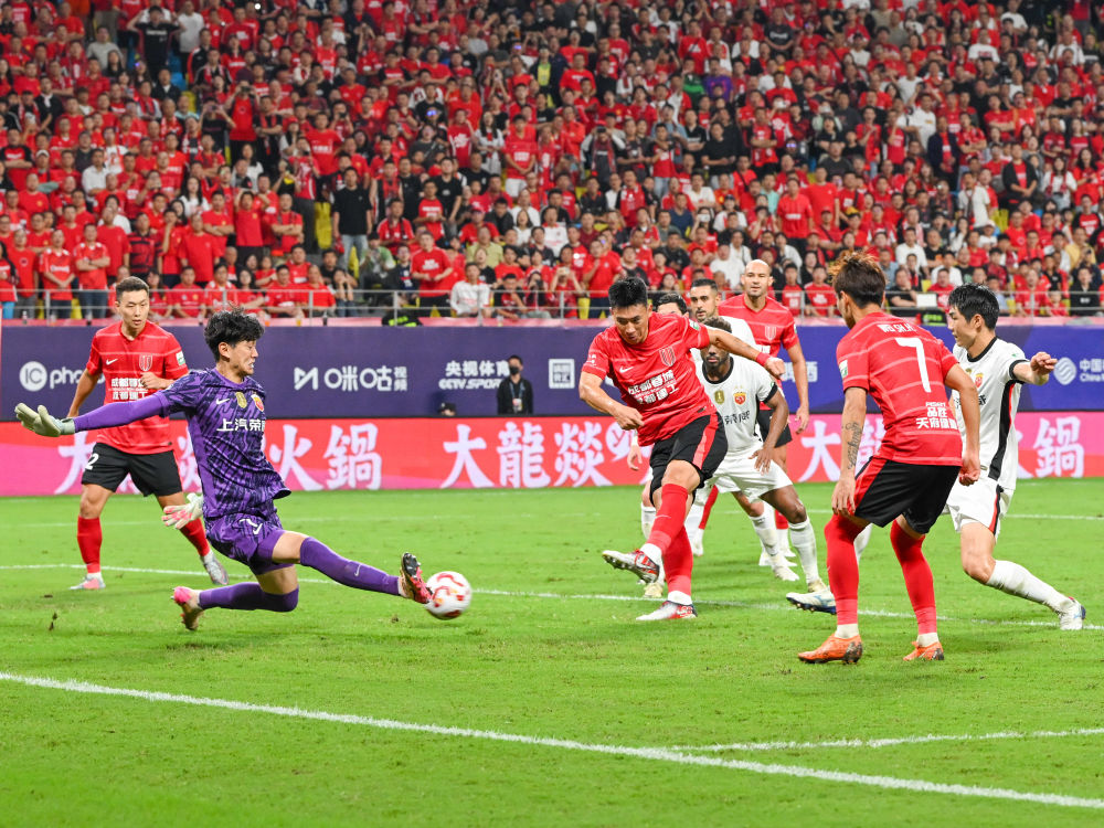 8月30日,成都蓉城隊球員楊帥(左三)在比賽中射門。當日,在四川成都進行的中國足球超級聯賽第23輪比賽中,成都蓉城隊主場4:1戰勝上海海港隊。新華社記者 王曦 攝