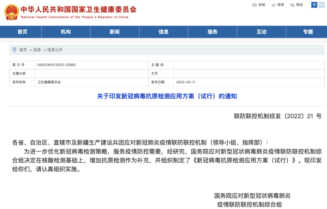 通知指出,為進一步優化新冠病毒檢測策略,服務疫情防控需要,經研究,國務院應對新型冠狀病毒肺炎疫情聯防聯控機制綜合組決定在核酸檢測基礎上,增加抗原檢測作為補充。