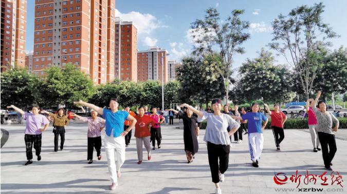 8月10日早上,民心家園小區居民在比鄰的遺山公園內跳舞、走旗袍秀,展示精神風貌,享受幸福生活。 曹建華 攝