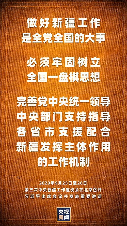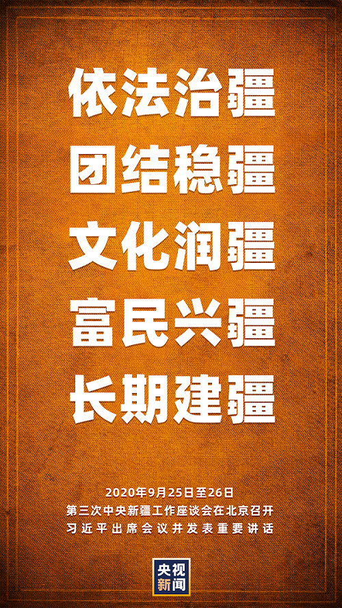 第三次中央新疆工作座談會9月25日至26日在北京召開。中共中央總書記、國家主席、中央軍委主席習近平出席會議并發表重要講話。 20字方針