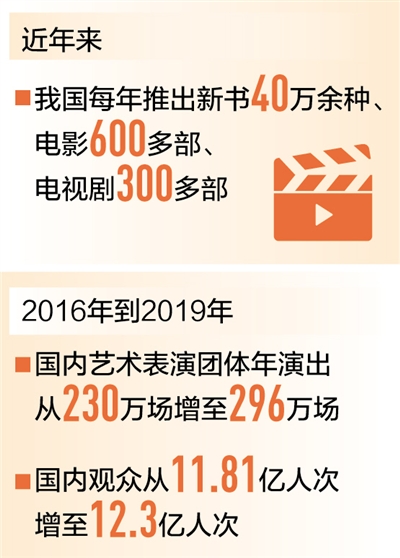 在作品質量提升的同時,我國文化產品的供給能力也在持續增強。目前我國每年推出新書40萬余種、童書4萬多種、電影600多部、電視劇300多部、動漫400多部……眾多文化產品的生產規模位居世界前列。演出市場持續繁榮,2016年到2019年,國內藝術表演團體年演出場次從230萬場增長至296萬場,國內觀眾從11.81億人次增加至12.3億人次,其中農村觀眾超過7億人次。