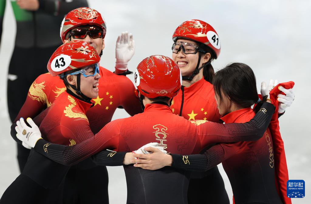 2022年2月5日,在首都體育館舉行的北京2022年冬奧會短道速滑項目混合團體接力決賽中,中國隊奪得冠軍。這是中國隊選手在比賽后慶祝。新華社記者 楊磊 攝