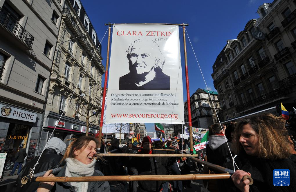 2010年3月6日,在比利時首都布魯塞爾,婦女代表抬著著名女政治活動家、三八國際婦女節的倡導者克拉拉·蔡特金的畫像參加慶祝三八國際勞動婦女節游行。新華社記者 武巍 攝