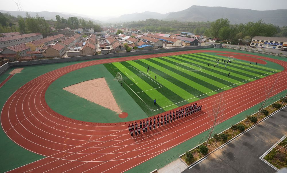 在位于山東濰坊市臨朐縣石家河村的臨朐縣彌水教育集團石家河校區,學生在操場塑膠跑道上進行體育鍛煉(2025年4月17日攝)。新華社記者 徐速繪 攝