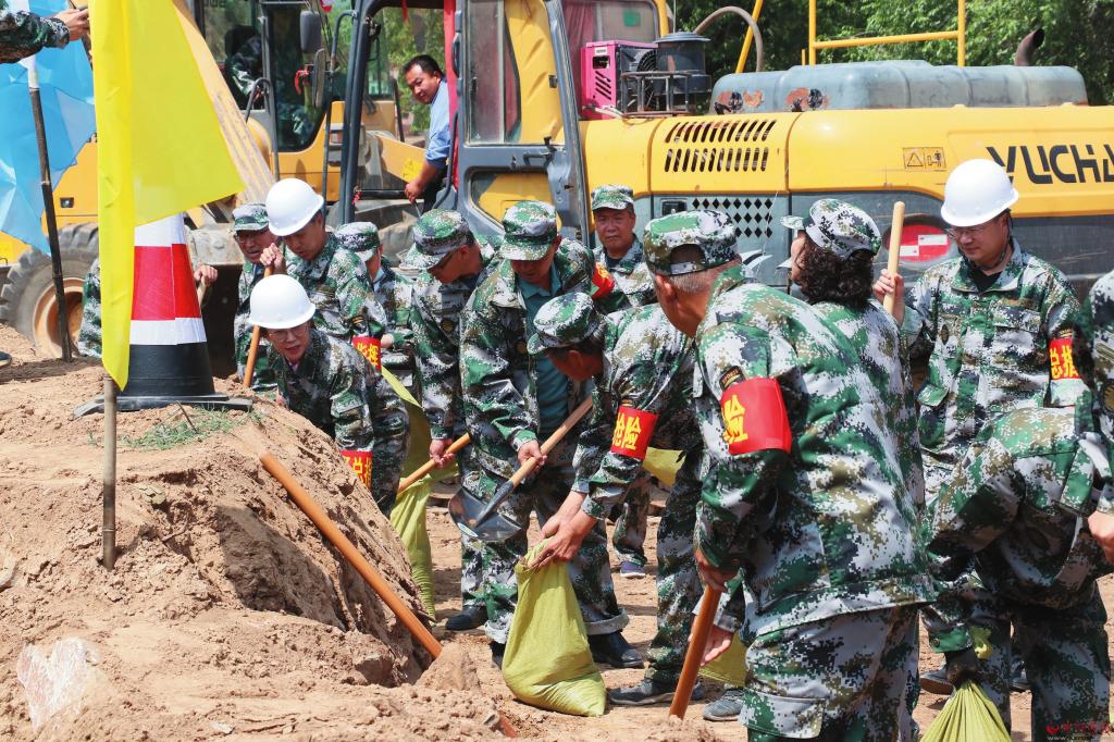 6月12日,原平市交通建設中心舉行了防汛應急搶險演練,檢驗了全體職工防汛搶險組織能力、快速反應能力和現場操作能力,全力確保安全度汛。圖為演練人員裝土袋搶修變道。(劉建春 攝)