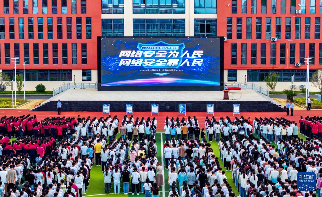 月11日,在貴州省黔西第一中學(xué),公安民警為學(xué)生講解網(wǎng)絡(luò)安全知識(無人機(jī)照片)。(新華社發(fā) 范暉 攝)