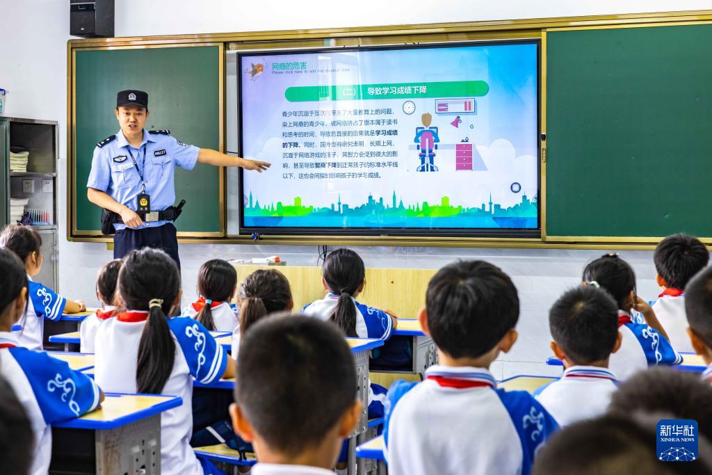 9月11日,公安民警在貴州省銅仁市玉屏侗族自治縣印山民族小學(xué)給學(xué)生講解網(wǎng)絡(luò)安全知識。(新華社發(fā) 胡攀學(xué) 攝)