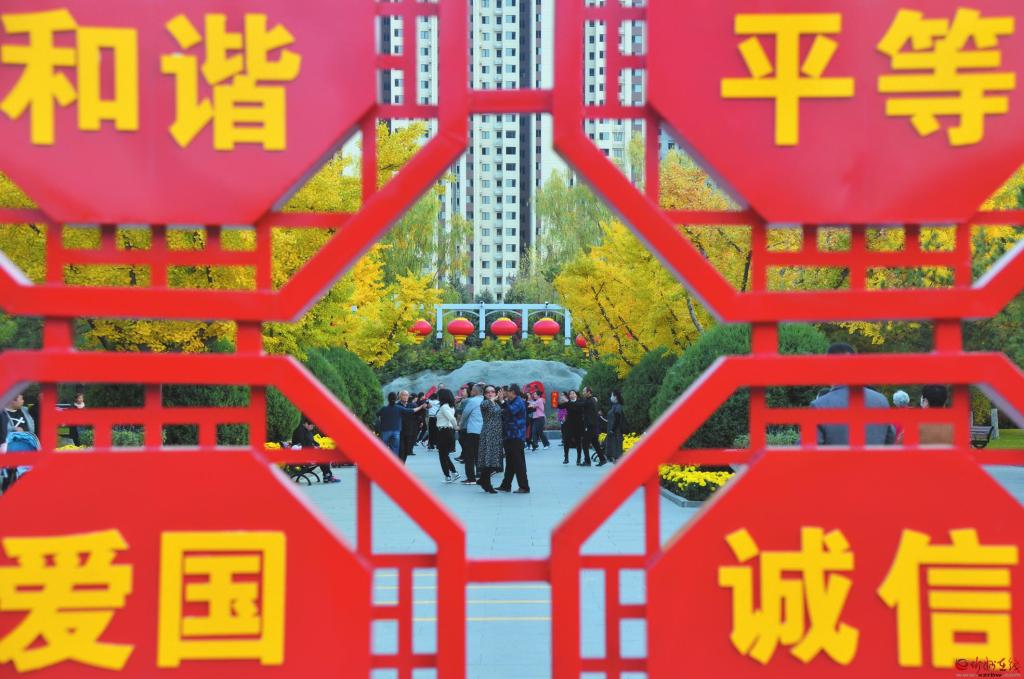 在我市中心城區的公園、廣場和城市綠地中,以社會主義核心價值觀、文明城市創建、優秀傳統文化等為主題的宣傳展板、景觀造型隨處可見,在弘揚傳統文化、傳播城市文明的同時,給市民帶來視覺上的藝術享受,讓游客在游園賞景中受到熏陶。 (張存良 攝)