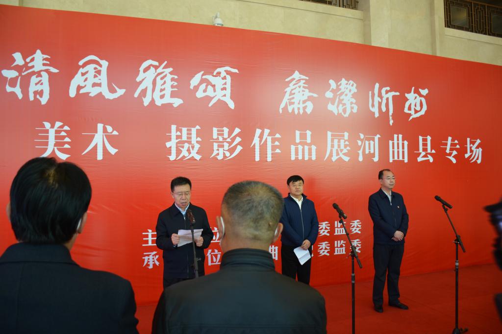 翰墨丹青揚(yáng)正氣,清風(fēng)廉韻沁民心。11月10日,由忻州市紀(jì)委監(jiān)委主辦,河曲縣紀(jì)委監(jiān)委承辦的“清風(fēng)雅頌·廉潔忻州”書畫美術(shù)攝影展河曲縣專場,在臨隩公園美術(shù)館開展。市政協(xié)副主席、縣委書記邊東圣出席儀式并作重要講話,縣委副書記、縣長任鴻賓宣布“清風(fēng)雅頌·廉潔忻州”書法美術(shù)攝影展開展,縣委常委、縣紀(jì)委書記、縣監(jiān)委主任張永明主持開展儀式。縣四大班子領(lǐng)導(dǎo)和其他縣處級領(lǐng)導(dǎo),全縣各鄉(xiāng)鎮(zhèn)、居民辦、黨群、政府、發(fā)改、農(nóng)口、政法、宣傳文衛(wèi)各口黨員干部及全體紀(jì)檢監(jiān)察干部共計(jì)180余人參加了開展儀式。
