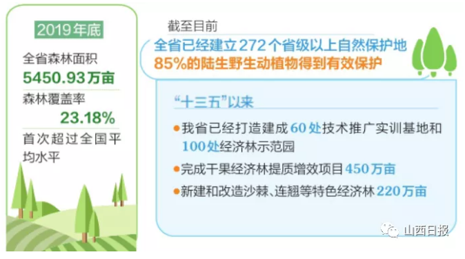 40多年來,我省集成推廣干石山區抗旱造林、黃土丘陵區徑流林業、風沙區生態治理等一系列抗旱造林技術,并依托11個國家級重點科研平臺等,加快全省大規模國土綠化進程。特別是黨的十八大以來,我省統籌山水林田湖草沙系統治理,以“兩山”生態系統保護和修復重大工程為引領,突出加強林草生態科技的集成組裝,綜合濕地生態修復、礦區生態修復、綠色廊道建設、園林配置、山垣溝壑綜合治理等技術,高質量推進國土綠化。2019年底,全省森林面積5450.93萬畝,森林覆蓋率23.18%,首次超過全國平均水平。