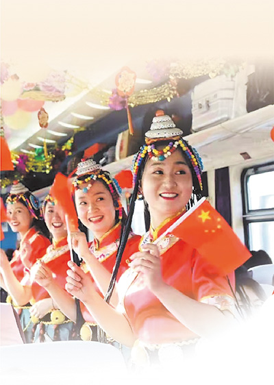 西寧開往拉薩的列車上,乘務人員與旅客聯歡。資料照片