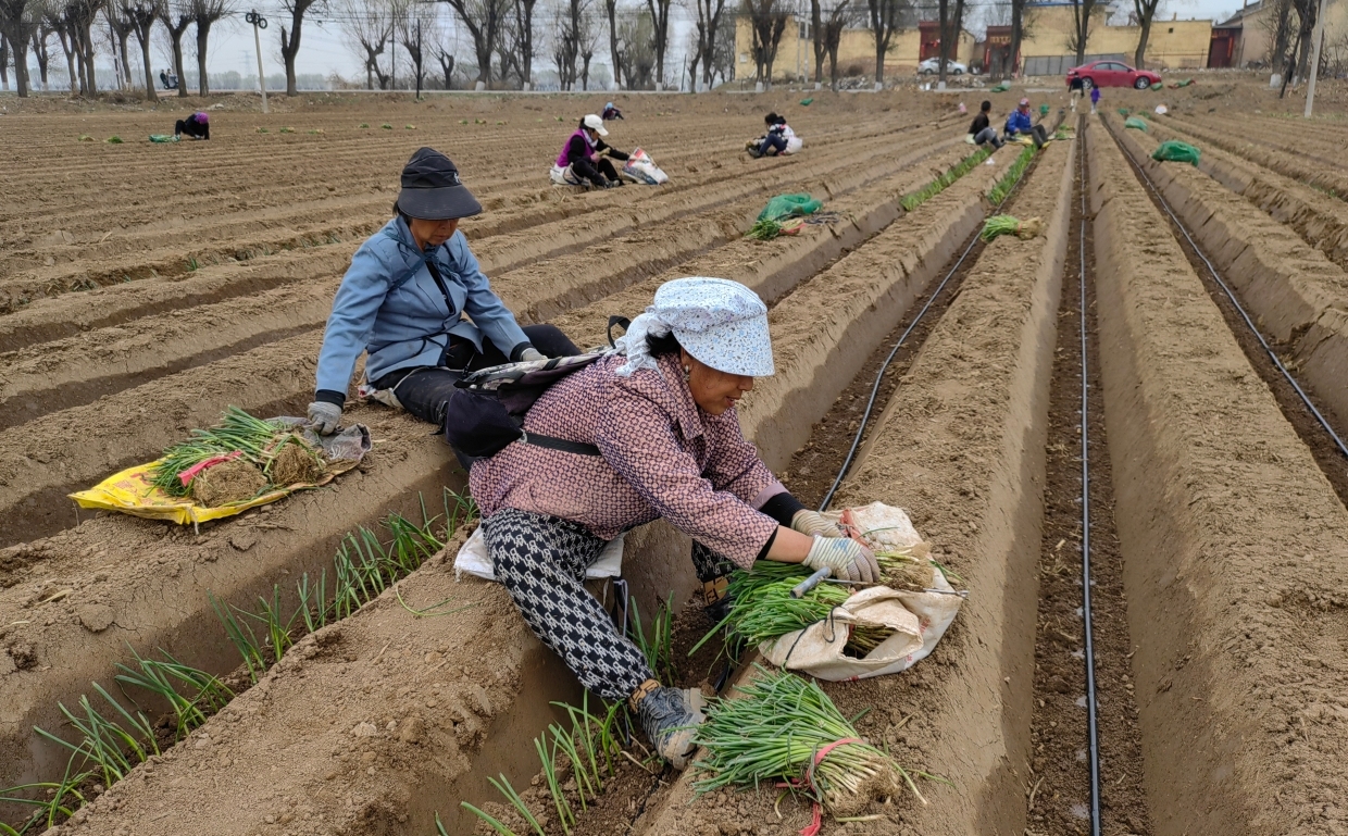 4月6日,定襄縣黃咀村寬廣的農田里,村民正熟練地進行蔥苗種植。
