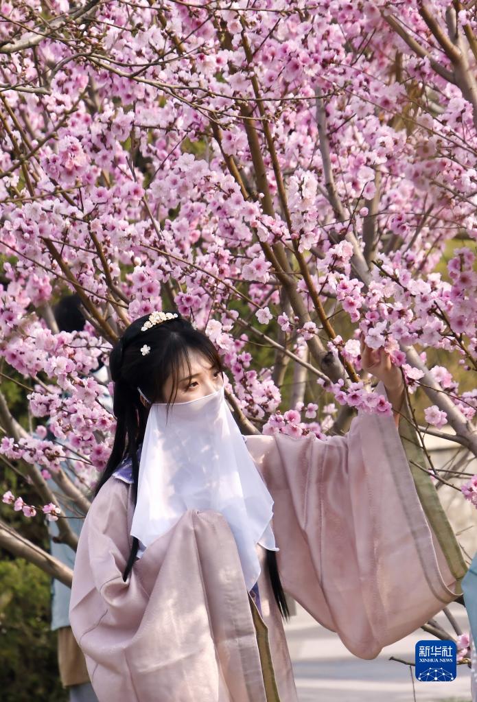 4月4日,一名身著漢服的姑娘在豐臺區世界花卉大觀園內賞花拍照。(新華社記者 李欣 攝)