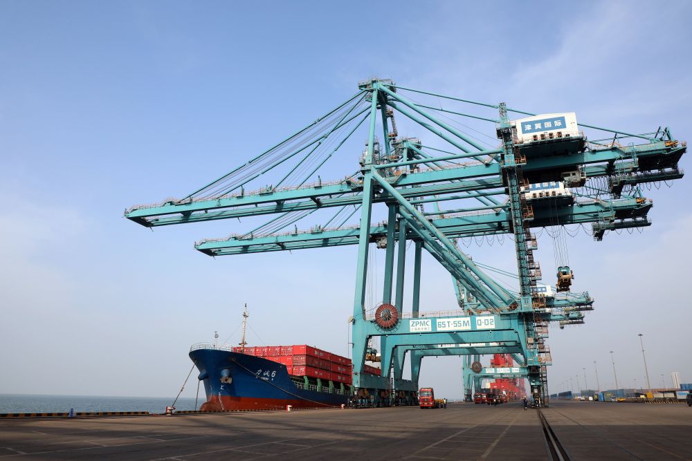 3月9日,船舶停靠在黃驊港綜合港區集裝箱碼頭進行卸船作業。新華社記者 駱學峰 攝