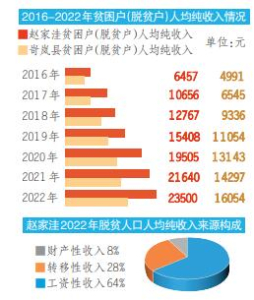 趙家洼重生了。盛夏6月,東西兩面山坡放眼望去,昔日荒坡披上了層層綠裝,郁郁蔥蔥,生機勃勃。搬到縣城的趙家洼人,收入一路高漲,從2016年的6457元增加到去年的23500元。