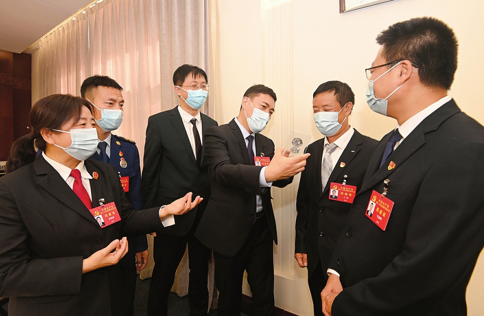 10月18日,出席黨的二十大的山西團代表田亞欣、張高峰、張靖、牛國棟、王春、馬黎明(自左至右)在會議間隙圍繞創新是第一動力話題展開討論。(記者李聯軍攝)