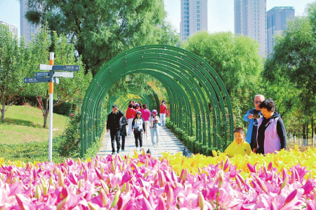 10月11日,正逢重陽,太原市晉陽湖公園內百合盛放、美不勝收,吸引了眾多市民前來觀賞。 趙夏雨攝