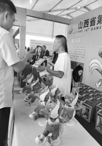 開幕式前,提前一兩個小時安檢入場的觀眾,遠遠就看到“翔翔”的召喚,紛紛在吉祥物專營區扎堆。“68元一個,就剩30個了。”專營區的售賣者告訴山西晚報記者,他們也沒想到這只褐馬雞如此受歡迎,很快就要被搶沒了。大同的趙女士搶到一個,她說朋友從外地剛回來不方便出門,讓她買一個留作紀念。