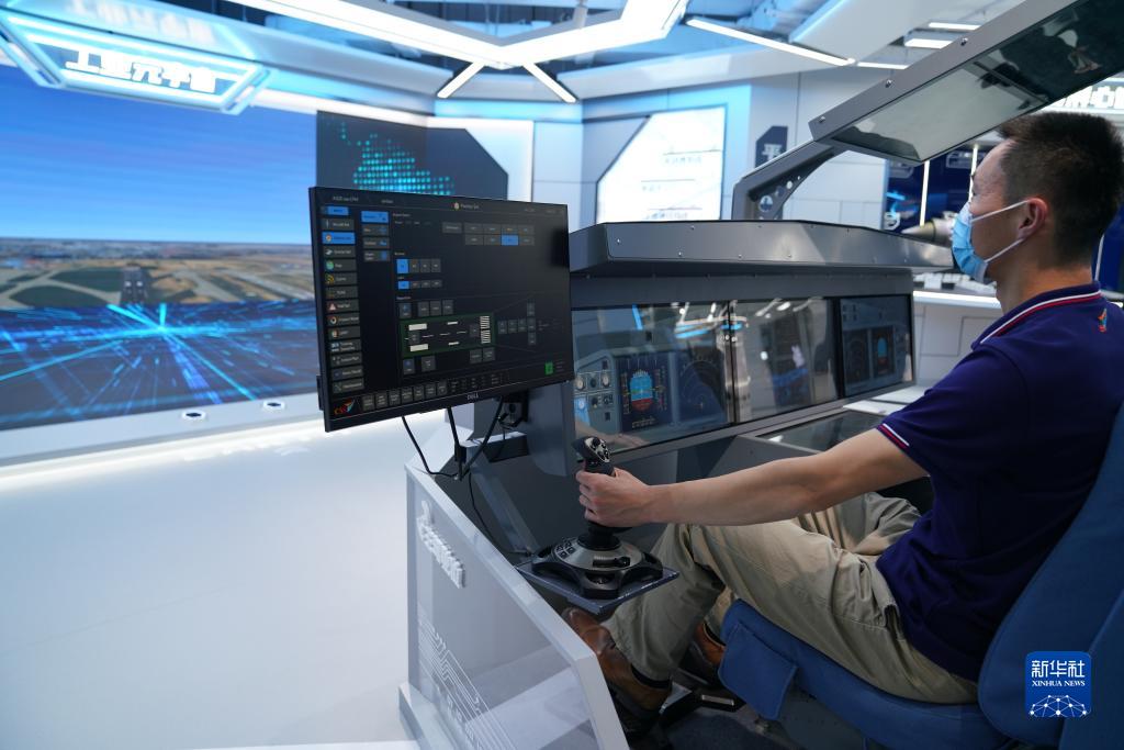 5月11日,在上海城市數字化轉型體驗館,工作人員操作一款數字化飛行仿真訓練平臺。新華社記者 馬寧 攝